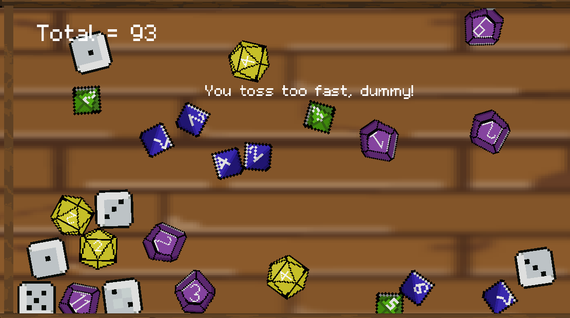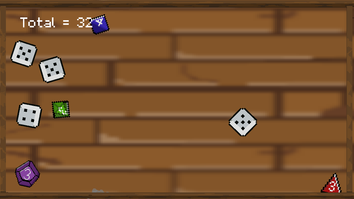 A simple 2D pixelated dice game where you can toss around dices for D&D game sections or just mess around with it. It's still in development so in the near future there will be more dices, a Ui menu for spawning the dices and more.